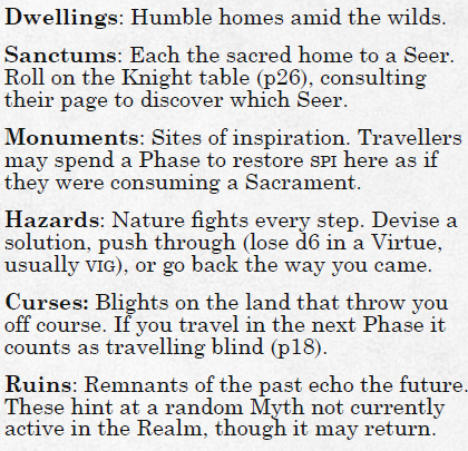 The Wilderness procedures the game has are incredibly simple to run, and so fantastically satisfying. They rely chiefly on the roll of the dice (d6) and on improvisation, itself made easy thanks to the dozens of prompts found at the bottom of each Knight and Myth page.
