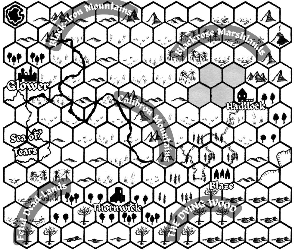 One needs a hex map to play Mythic Bastionland. 12x12 is optimal, but if you're running the game for a smaller group or feel intimidated at the thought of populating a whopping 144 hexes, a smaller map is acceptable. No need to feel intimidated, however: McDowall doesn't expect you to create a hundred-page lore document, or a ten-page one, or even a five-page one. In truth, you need to roll a few dice, name a few geographic locales, and be prepared for a whole lot of improv on the table.