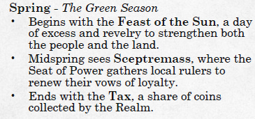 After it came the even more fun part: I rolled for six myths from page 27 of the rulebook, read through them, and placed them on the map. I also placed the Seat of Power and three other Holdings, named a bunch of geographic locales, and wrote a short introductory blurb to the Realm:
