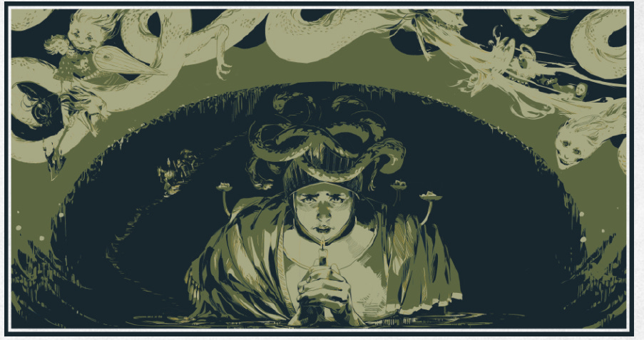 Okay, but how does all this translate to teaching my players OSR philosophy? For one, Mythic Bastionland teaches all of us to embrace randomness: the dice told a story through luck and save rolls, through the entirely random wilderness rolls that produced first the Hydra Myth and Candle Knight they met, and then the exact landmark that could’ve given them answers to the mystery of the Hydra they wanted to explore at this juncture. If they’d instead come across a different landmark--say, a dwelling--they likely would have encountered the first Omen to a wholly different Myth.